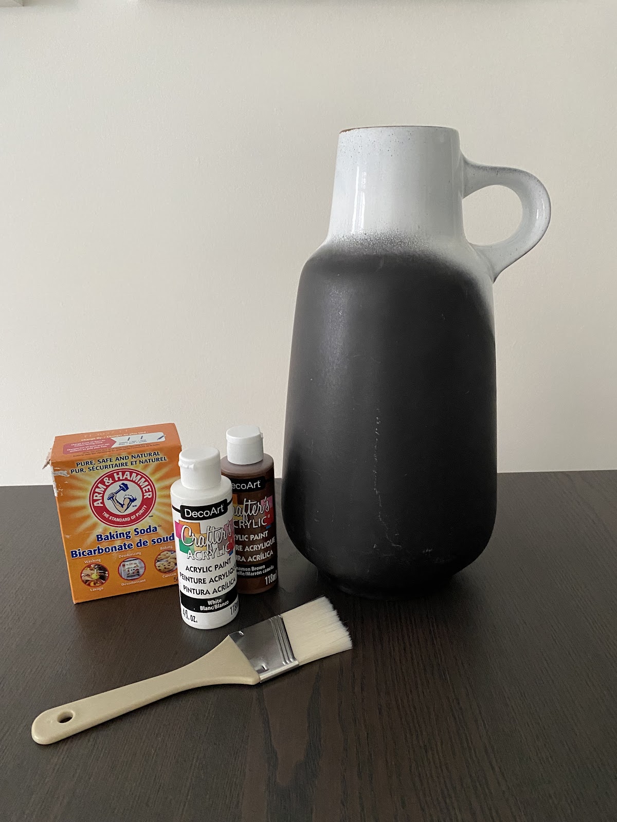 If you want a vase with a ceramic look on a budget, this DIY is for you! All you need is a vase (use something you already own or check your local thrift store), paint and paintbrush, and baking soda. You might even have these materials at home already.